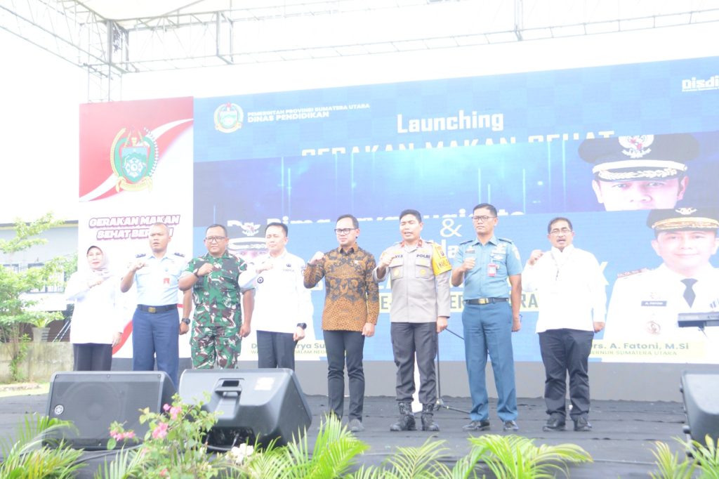 TNI AL, Belawan,- Komandan Pangkalan Utama TNI Angkatan Laut I (Danlantamal) I Brigjen TNI (Mar) Jasiman Purba, S.E., CHRMP., diwakili Aspotmar Danlantamal I Kolonel Marinir Hendra Zarnadi, S.Sos., M.Tr. Opsla., bersama Forum Koordinasi Pimpinan Daerah (Forkopimda) Provinsi Sumatera Utara, menghadiri Launching Gerakan Makan Sehat Bergizi Serentak dan Deklarasi Sekolah Ramah Anak Se-Sumut, yang dipimpin Wakil Menteri Dalam Negeri Republik Indonesia Dr. Bima Arya Sugiarto, bertempat di Lapangan SMA Swasta Dharma Pancasila, Medan, Sumatera Utara, Rabu (11/12/2024).