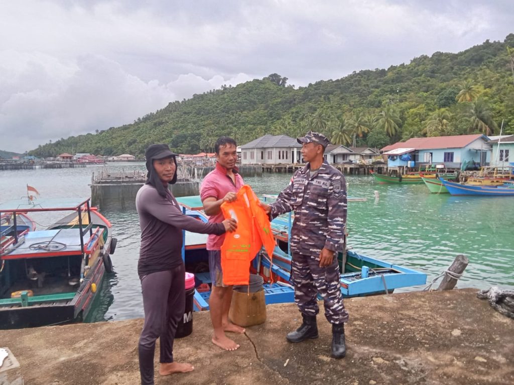 TNI AL, Kepulauan Anambas,- Menindaklanjuti Perintah Lisan Komandan Lanal Tarempa Letkol Laut (P) Ari Sukmana, S.E., M.Tr.Opsla., terkait cuaca buruk, hujan badai, angin kencang, dan gelombang tinggi yang saat ini berlangsung di Perairan Kepulauan Anambas, Posal memperuk yang berada di Pulau Munjan, Kecamatan Siantan Timur, Kabupaten Kepulauan Anambas meminta kepada warga Desa Munjan yang akan pergi berlayar untuk menggunakan alat keselamatan seperti Life Jacket serta menghimbau agar berhati–hati saat berlayar mengingat kondisi cuaca buruk saat ini, Jumat (13/12/2024).