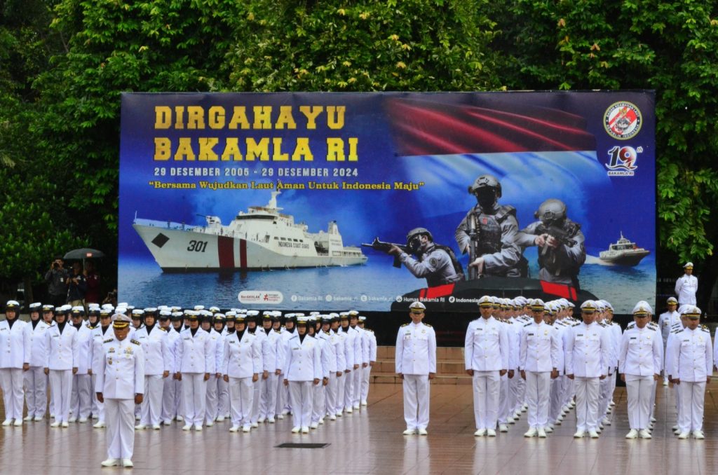Jakarta, 14 Januari 2025 (Bakamla RI/Indonesian Coast Guard) – Badan Keamanan Laut Republik Indonesia (Bakamla RI) memperingati Hari Ulang Tahun (HUT) ke-19 dengan penuh semangat. Upacara yang dipimpin oleh Kepala Bakamla RI, Laksamana Madya TNI Dr. Irvansyah, S.H.,M.Tr.Opsla ini mengusung tema “Bersama Wujudkan Laut Aman untuk Indonesia Maju.”, Jakarta, Selasa (14/1/2025)