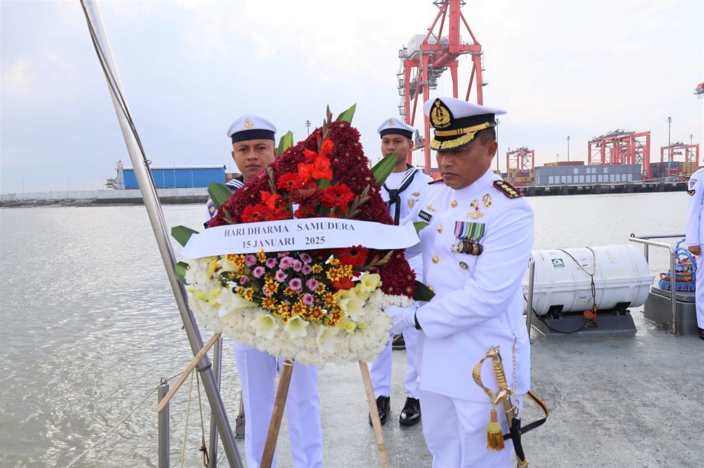 TNI AL, Belawan,- Komandan Pangkalan Utama TNI Angkatan Laut I (Danlantamal I) Brigjen TNI (Mar) Jasiman Purba, S.E., CHRMP., diwakili oleh Wadan Lantamal I Kolonel Laut (P) Baharudin Anwar, S.T., M.M., memimpin Upacara Tabur Bunga di Laut dalam rangka memperingati Hari Dharma Samudera Tahun 2025, bertempat diatas KAL Tarihu I-1-64, Rabu (15/1/2025).