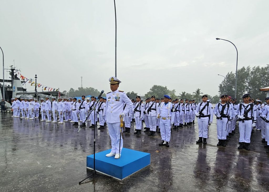 TNI AL, Bintan,- Dengan semangat patriotisme dibawah guyuran hujan yang sangat deras, Danlanal Bintan Kolonel Laut (P) Dr. Eko Agus Susanto, S.E., M.M., tetap semangat pimpin Upacara Hari Dharma Samudera Tahun 2025 Satuan-satuan Koarmada I Tanjung Uban di Dermaga Lanal Bintan, Rabu (15/01/2025).