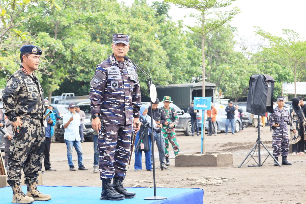 TNI AL-Dispenlantamal3. Komandan Pangkalan Utama TNI Angkatan Laut (Danlantamal) III Jakarta Brigjen TNI (Mar) Harry Indarto, S.E., M.M. memimpin apel gelar pasukan dan material dalam mendukung pembongkaran pagar laut di Tanjung Pasir Tangerang, yang disaksikan langsung oleh Kepala Staf Angkatan Laut (Kasal) Laksamana TNI Dr. Muhammad Ali, S.E., M.M., M.Tr.Opsla., Menteri Kelautan dan Perikanan RI Ir. Sakti Wahyu Trenggono, M.M., dan Menteri Agraria dan Tata Ruang (ATR) RI/Kepala Badan Pertanahan Nasional (BPN) Nusron Wahid, S.S., M.Si., dan Ketua Komisi IV DPR RI Siti Hediati, S.E. bertempat di laut Tanjung Pasir, Tangerang, Banten, Rabu (22/01/2025).