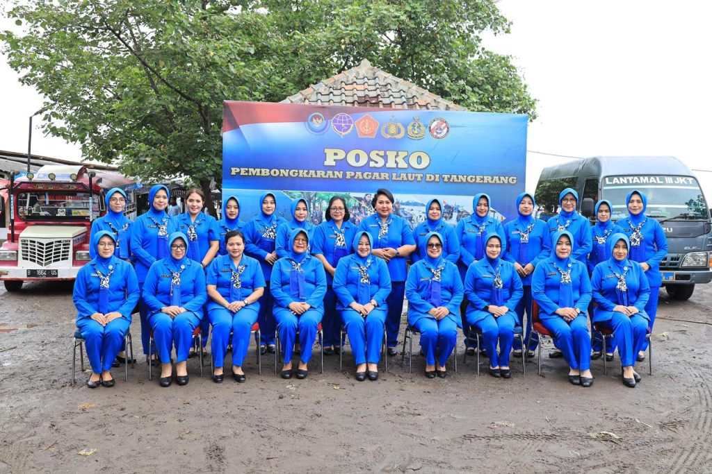 TNI AL-Dispenlantamal3. Ketua Koordinator Cabang (Korcab) III Daerah Jalasenastri Armada I Ny. Neneng Harry Indarto mendampingi Ketua Gabungan Jalasenastri Armada RI Ny. Kiki Denih Hendrata mengunjungi Posko Pembongkaran Pagar Laut sekaligus memberikan dukungan logistik kepada prajurit TNI Angkatan Laut dan masyarakat nelayan yang ikut terlibat pembongkaran pagar laut, dihadiri Ketua Daerah Jalasenastri Armada (DJA) I Ny. Yanti Yoos Suryono, bertempat di Posko Pembongkaran Pagar Laut, Tanjung Pasir, Tangerang, Rabu (29/01/2025).
