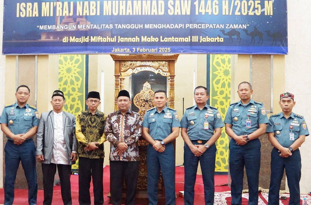 TNI AL-Dispenlantamal3. Komandan Pangkalan Utama TNI Angkatan Laut (Danlantamal) III Jakarta Brigjen TNI (Mar) Harry Indarto, S.E., M.M. diwakili Asisten Personalia (Aspers) Danlantamal III Jakarta Kolonel Laut (S) Abu Ali, S.E., M.Tr.Opsla. melaksanakan peringatan Isra’ Mi’raj Nabi Muhammad Shalallahu Alaihi Wassalam (SAW) yang dihadiri prajurit dan Pegawai Negeri Sipil (PNS) di lingkungan Lantamal III Jakarta serta Wakil Ketua Koordinator Cabang (Korcab) III Daerah Jalasenastri Armada (DJA) I Ny. Sisca Ranu Samiaji beserta pengurus, dengan penceramah Dr. K.H. Abi Ikhwanuddin, M.A. bertempat di masjid Miftahul Jannah Mako Lantamal III Jakarta Jl. Gunung Sahari No. 2, Jakarta Utara, Senin (03/02/2025).