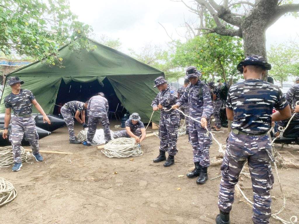 TNI AL-Dispenlantamal3. Komandan Pangkalan Utama TNI Angkatan Laut (Danlantamal) III Jakarta Brigjen TNI (Mar) Harry Indarto, S.E., M.M. terpaksa kembali menghentikan sementara pelaksanaan pembongkaran pagar laut di dua titik, yaitu di perairan Kohod dan perairan Kronjo sebagai akibat angin kencang dan ombak tinggi, bertempat di Posko Pembongkaran Pagar Laut, Tanjung Pasir, Tangerang, Kamis (06/02/2025).