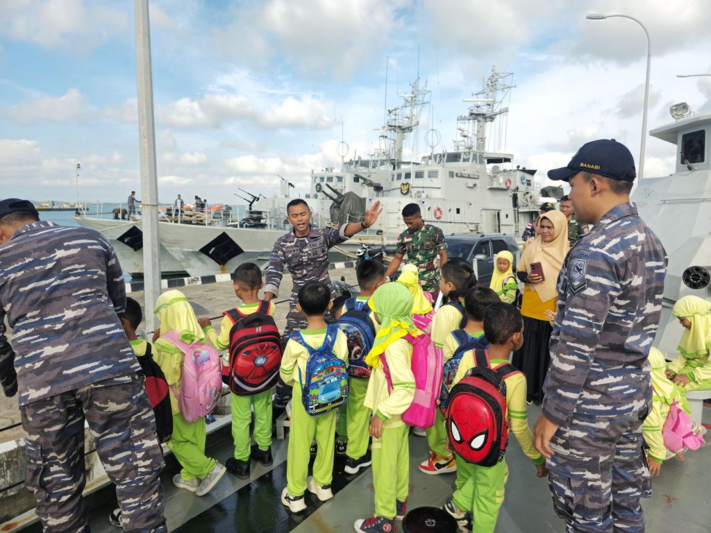 TNI AL, Bintan,- Antusiasme Siswa/Siswi Paud Nurul Istiqomah, Lobam, Seri Kuala Lobam, Bintan, bisa melihat dan naik Kaapal Perang Republik Indonesia atau KRI dengan pengawasan oleh Prajurit Lanal Bintan dan Prajurit KRI Clurit-641 yang saat ini sandari di Dermaga Lanal Bintan Tanjung Uban, Sabtu (15/02/2025).