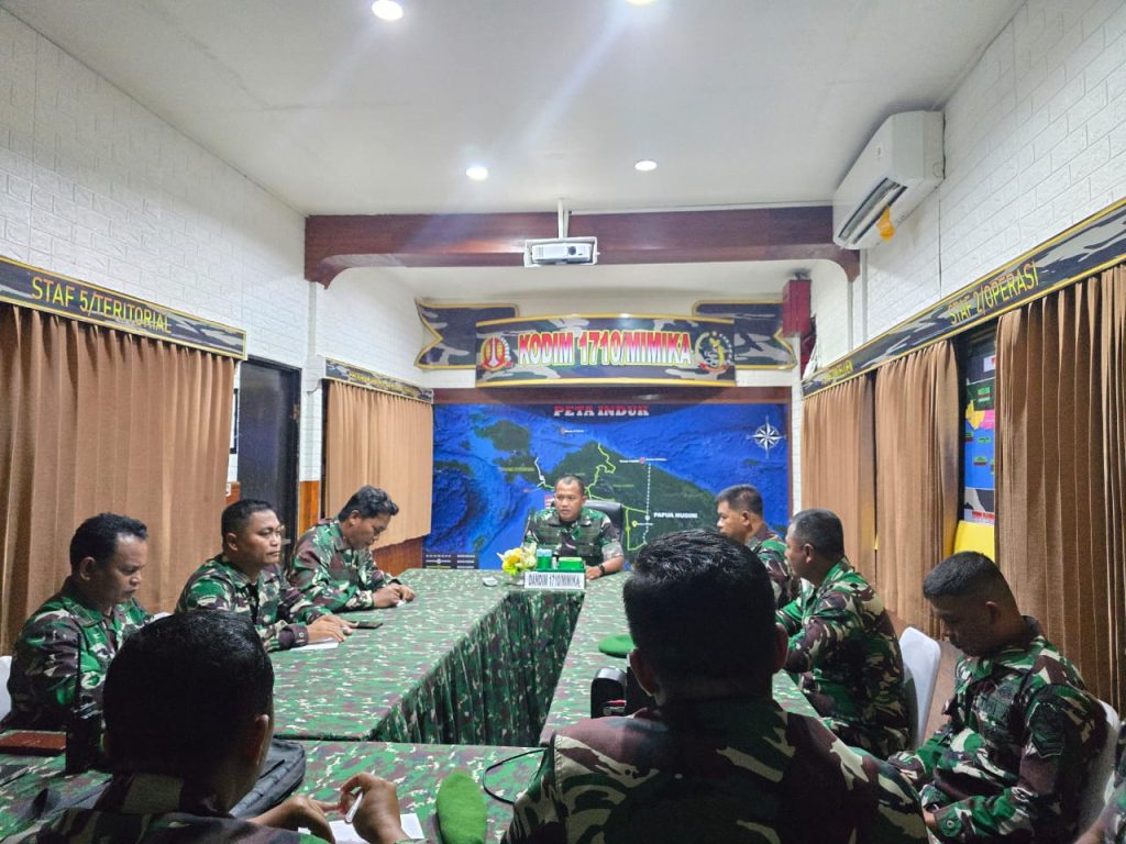 Timika – Untuk menyamakan persepsi dan visi dalam pelaksanaan tugas, Dandim 1710/Mimika, Letkol Inf M. Slamet Wijaya, S.Sos., M.Han., M.A. melaksanakan rapat dengan jajaran Staf dan Koramil, Senin (03/03/2025). Kegiatan ini dilaksanakan di ruang data Makodim 1710/Mimika, Distrik Kuala Kencana, Kabupaten Mimika dan diikuti oleh semua Perwira Staf dan Danramil atau yang mewakili.