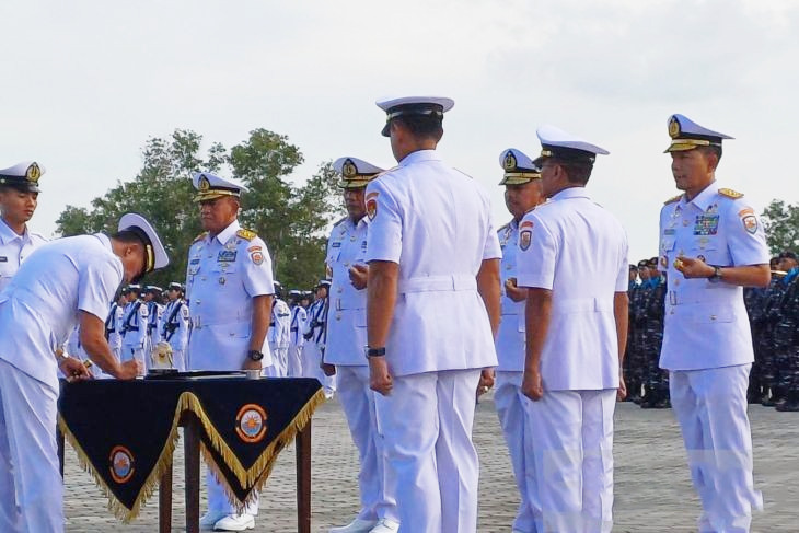 TNI AL-Dispenlantamal3. Komandan Pangkalan Utama TNI Angkatan Laut (Danlantamal) III Jakarta Brigjen TNI (Mar) Harry Indarto, S.E., M.M. didampingi Ketua Koordinator Cabang (Korcab) III Daerah Jalasenastri Armada (DJA) I Ny. Neneng Harry Indarto menghadiri upacara serah terima jabatan (Sertijab) Panglima Komando Armada (Pangkoarmada) I dari Laksda TNI Dr. Yoos Suryono Hadi, M.Tr.(Han)., M.Tr.Opsla. kepada Laksda TNI Fauzi, S.E., M.M., M.Tr.Opsla., M.Tr.Han., dan Pangkoarmada II dari Laksda TNI Ariantyo Condrowibowo, M.Tr.Opsla. kepada Laksda TNI I Gung Putu Alit Jaya, S.H., M.Si., dengan Inspektur Upacara (Irup) Pangkoarmada RI Laksdya TNI Dr. Denih Hendrata, S.E., M.M., dan dihadiri Ketua Gabungan Jalasenastri Armada RI Ny. Kiki Denih Hendrata bertempat di lapangan upacara Mako Koarmada I, Tanjung Pinang, Kepulauan Riau, Senin (17/03/2025).