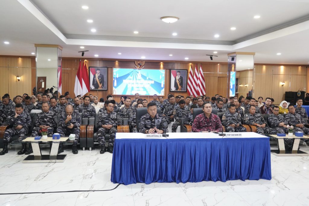 TNI AL-Dispenlantamal3. Komandan Pangkalan Utama TNI Angkatan Laut (Danlantamal) III Jakarta Brigjen TNI (Mar) Harry Indarto, S.E., M.M. mengikuti pemberian paket lebaran TNI Angkatan Laut 1446 H/2025 M kepada prajurit dan Pegawai Negeri Sipil (PNS) di lingkungan TNI Angkatan Laut secara serentak di seluruh wilayah Indonesia yang dipimpin oleh Kepala Staf Angkatan Laut (Kasal) Laksamana TNI Dr. Muhammad Ali, S.E., M.M., M.Tr.Opsla. melalui video conference (Vicon), dihadiri Pimpinan Cabang BRI Kemayoran Bagus Ersabrana selaku payroll bank bagi prajurit dan PNS di lingkungan Lantamal III Jakarta, bertempat di gedung serbaguna (GSG) Mako Lantamal III Jl. Gunung Sahari No. 2, Jakarta Utara, Rabu (26/03/2025)