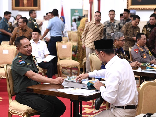 (Puspen TNI). Panglima TNI Jenderal TNI Agus Subiyanto bersama Kasad, Kasal dan Kasau mendampingi Presiden Republik Indonesia Prabowo Subianto dalam penyerahan zakat secara simbolis kepada Badan Amil Zakat Nasional (BAZNAS) di Istana Negara, Jakarta Pusat, Kamis (27/3/2025).