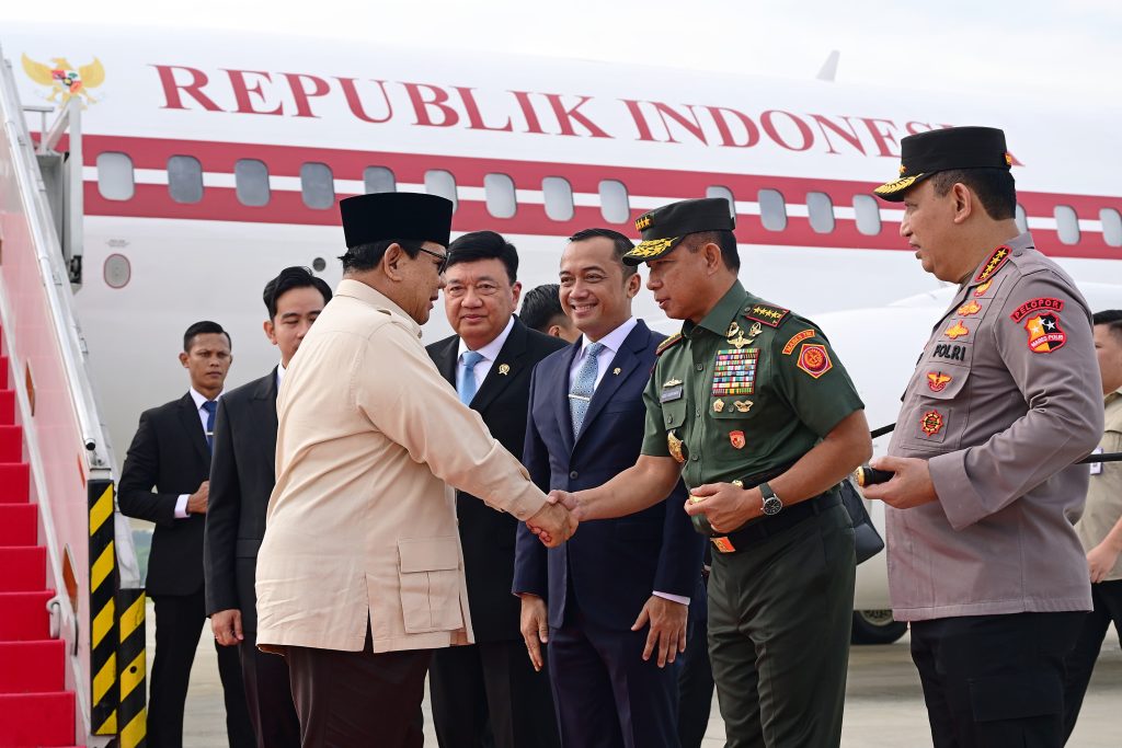 Puspen TNI – Panglima TNI Jenderal TNI Agus Subiyanto menyambut kedatangan Presiden Republik Indonesia Prabowo Subianto usai melaksanakan kunjungan kerja ke lima negara di kawasan Timur Tengah, bertempat di Baseops Lanud Halim Perdanakusuma, Jakarta Timur, Selasa (15/04/2025).