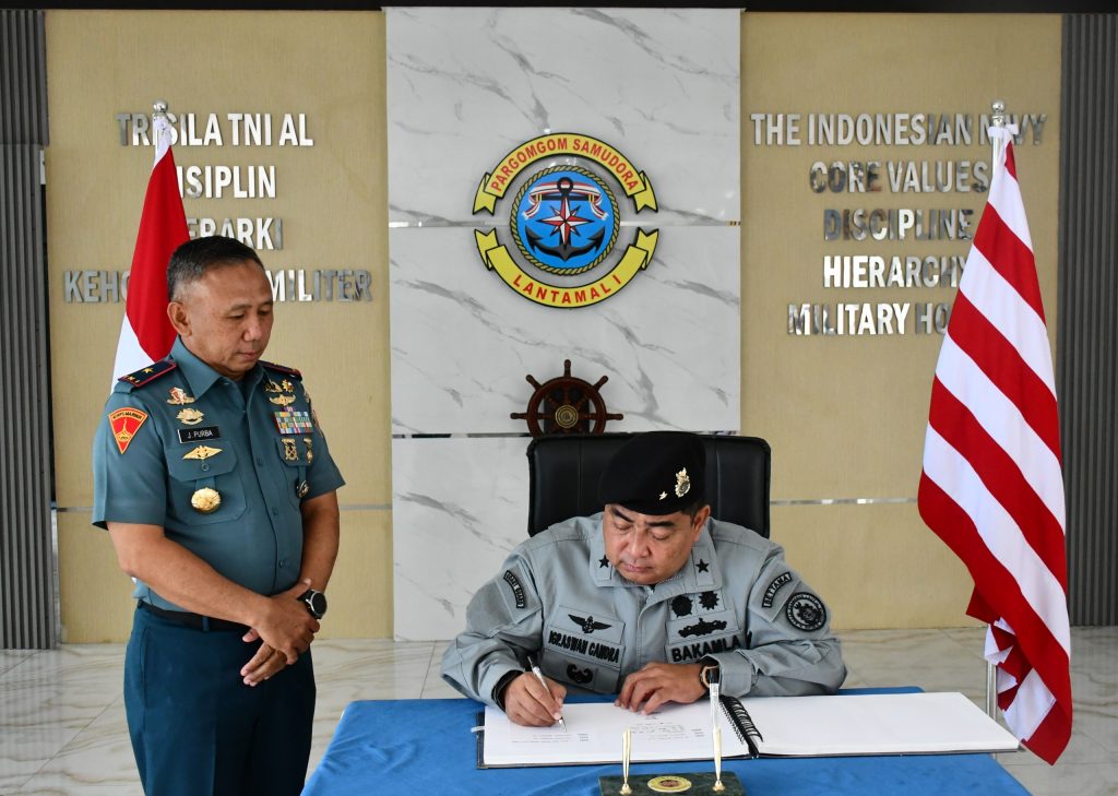 TNI AL, Belawan,- Komandan Pangkalan Utama TNI Angkatan Laut I (Danlantamal I) Brigjen TNI (Mar) Jasiman Purba, S.E., CHRMP., menerima Kunjungan Kerja dari Dirlitbang Bakamla RI Laksamana Pertama I Gusti Putu Aswan Candra, M.M., CHRMP., M.Tr.Opsla., beserta rombongan, bertempat di Ruang VIP Mako Lantamal I, Kamis (24/4/2025).