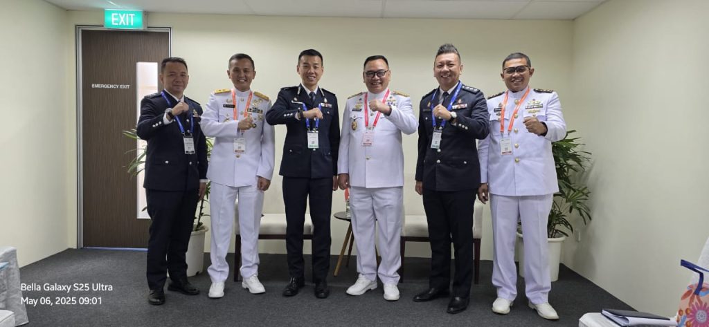 Singapura – Sekretaris Utama (Sestama) Bakamla RI Laksda Bakamla Dr. Samuel Kowaas, M.Sc., CSBA., bersama Deputi Informasi, Hukum, dan Kerja Sama (Inhuker) Bakamla RI Laksda Bakamla Ili Dasili, S.E., melaksanakan Courtesy Call dengan Commandant Singapore Police Coast Guard (SPCG) SAC Ang Eng Seng, di Changi Exhibition Center, Singapura, Rabu (7/5/2025).