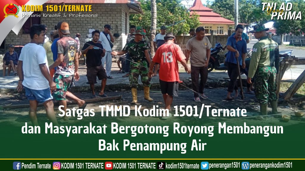 Ternate – Satuan Tugas (Satgas) TMMD Ke-124 Kodim 1501/Ternate bekerja sama dengan masyarakat Desa Lako Akediri Kec. Sahu menyiapkan bahan-bahan untuk membangun bak penampung air sumur bor, Sabtu (17/5/2025). Kegiatan ini merupakan bagian dari upaya untuk menyediakan sumber air bersih bagi masyarakat yang mengalami kesulitan mendapatkan air bersih.