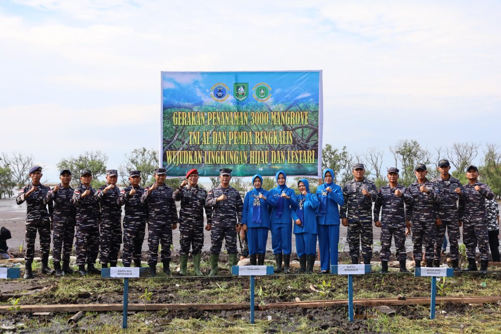 TNI AL, Dumai,- Dalam rangka meningkatkan kesadaran dan kepedulian terhadap lingkungan, Danlanal Dumai Kolonel Laut (P) Abdul Haris, S.E., M.M.D.S., dengan didampingi oleh Ketua Jalasenastri Cabang 4 Korcab I DJA I Ny. Dewi Abdul Haris, melaksanakan penanaman mangrove bersama Forkopimda dan masyarakat nelayan Desa Muntai Barat, Kecamatan Bantan, Bengkalis, Senin (19/05/2025).