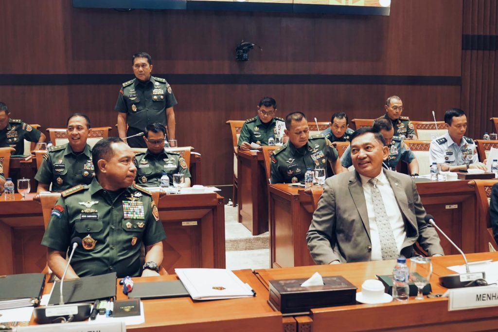 Puspen TNI – Panglima TNI Jenderal TNI Agus Subiyanto bersama Menteri Pertahanan (Menhan) RI Sjafrie Sjamsoeddin, didampingi para Kepala Staf Angkatan, menghadiri Rapat Kerja bersama Komisi I DPR RI dengan agenda Pembahasan Kondisi Geopolitik dan Skema Pertahanan Indonesia, bertempat di Ruang Rapat Komisi I, Gedung Nusantara II, Jakarta Pusat, Rabu (2/7/2025).
