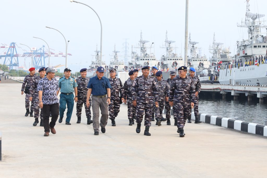 Komandan Lantamal III, Laksamana Pertama TNI Uki Prasetia, S.T., M.M. menyambut kedatangan Menteri Koordinator Bidang Infrastruktur dan Pembangunan Kewilayahan (Menko Infraswil), Agus Harimurti Yudhoyono, yang melaksanakan kegiatan bakti sosial di Perairan Ancol dan penandatangan Prasasti Plaza Canthoka Yudha di Satuan Kopaska Koarmada I, Pondok Dayung, Tanjung Priok, Jakarta Utara, Senin (28/7).