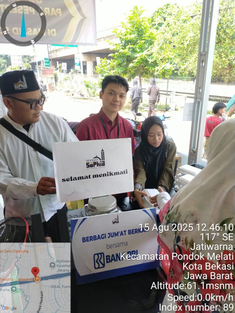 Usai pelaksanaan Shalat Jumat, ratusan jamaah dan masyarakat sekitar menerima paket makanan dalam program Berbagi Jumat Berkah yang digelar bersama Bank Rakyat Indonesia (BRI) KC Cimanggis.