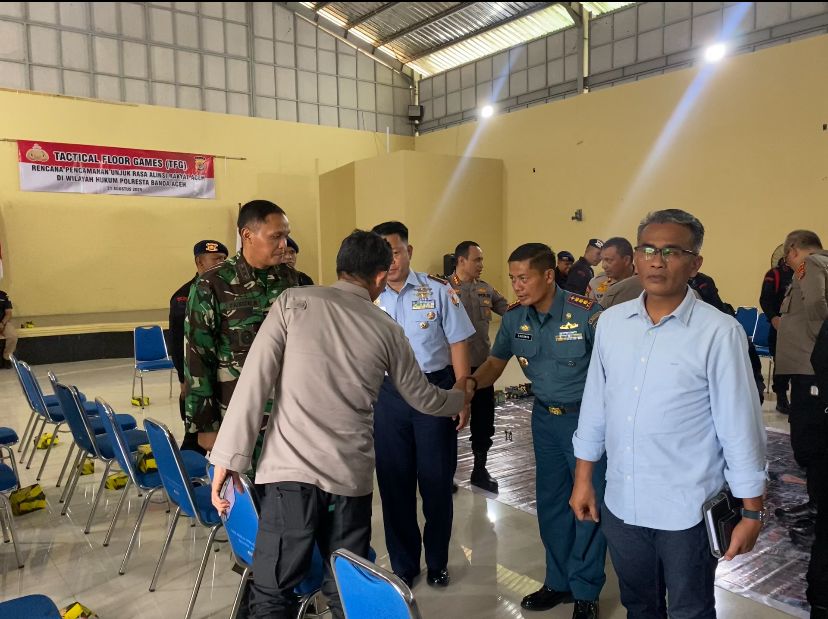 TNI AL, Sabang,- Dalam rangka menghadapi aksi unjuk rasa di Kota Banda Aceh, Polresta Banda Aceh menggelar TFG (Tactical Floor Game) dan Latihan Sistem Pengamanan Kota (Sispamkota) yang dihadiri Komandan Lanal Sabang Kolonel Laut (P) Sadimin, S.E.,M.Tr. Opsla., bertempat di Polresta Banda Aceh, Kp. Baru, Kecamatan Baiturrahman, Kota Banda Aceh, Minggu (31/8/2025).