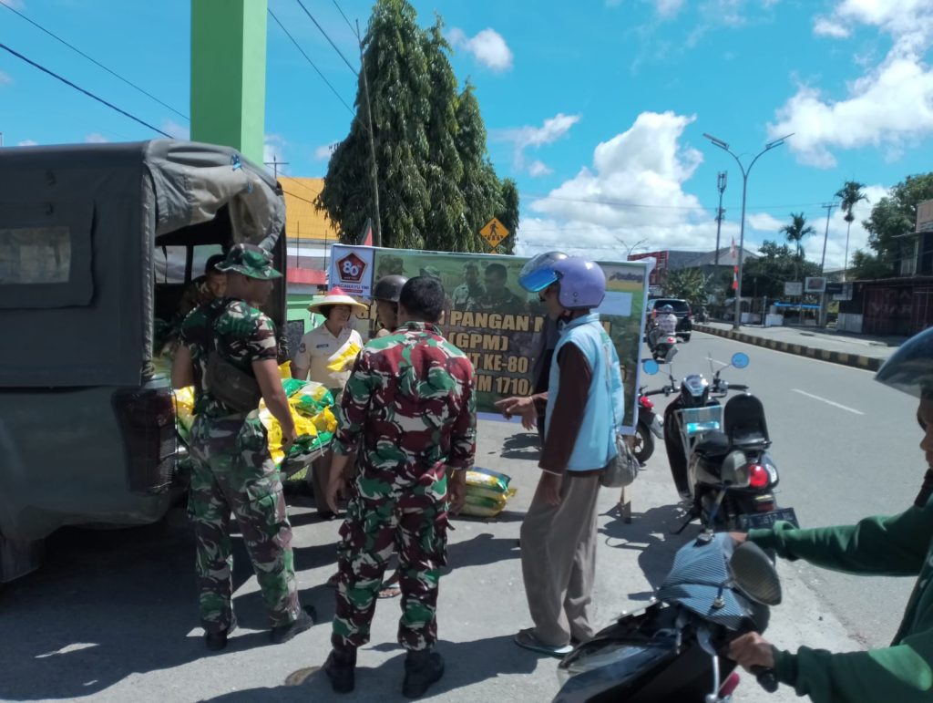 Timika – Kodim 1710/Mimika menggelar Gerakan Pangan Murah di Koramil 1710-02/Timika, Jl. Yos Sudarso, Distrik Mimika Baru, Kabupaten Mimika, Rabu (17/09/2025). Acara ini bertujuan untuk menstabilkan harga komoditas pangan khususnya beras selaku makanan pokok, serta membantu masyarakat mendapatkan bahan pokok dengan harga terjangkau.