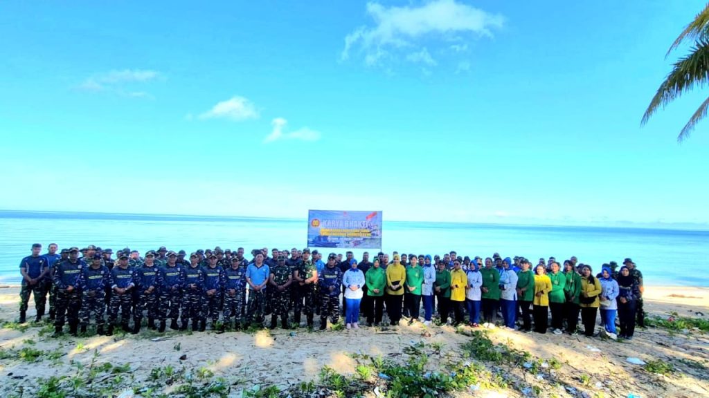 TNI AL, Ambon,- Dalam rangka memperingati Hari Ulang Tahun (HUT) TNI Ke-80, jajaran TNI baik TNI Angkatan Darat, TNI Angkatan Laut dan TNI ANgkatan Udara yang bertugas di wilayah Kabupaten Kepulauan Aru menggelar aksi pembersihan lingkungan di tempat wisata Batu Kora, Desa Wangel, Kecamatan Pulau-Pulau Aru, Selasa (30/9/2025).