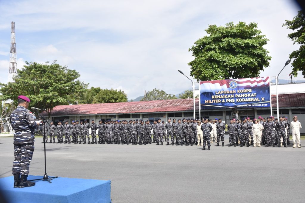 TNI AL, Jayapura,- Suasana haru dan kebanggaan menyelimuti Lapangan Apel Komando Daerah Angkatan Laut (Kodaeral) X pagi itu. Dibawah sinar matahari yang lembut, 33 prajurit menerima kenaikan pangkat, sementara 41 personel lainnya merayakan hari ulang tahun mereka bersama Keluarga Besar Kodaeral X. Momen istimewa ini dipimpin langsung oleh Komandan Kodaeral X Mayjen TNI (Mar) Werijon, M.Han., CIQnR., CIQaR., dalam Upacara Laporan Korps Kenaikan Pangkat Kala Waktu 1 Oktober 2025 yang dirangkaikan dengan perayaan ulang tahun personel dibulan Oktober, Jumat (10/10/2025).