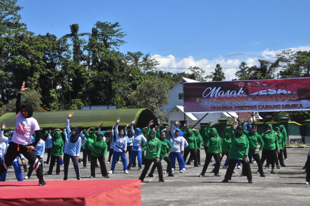 Timika – Bertempat di Lapangan Upacara Makodim 1710/Mimika, Kodim 1710/Mimika bersama Kogabwilhan III berkolaborasi dengan Youtuber Bobon Santoso menggelar Masak Besar dan Olahraga Bersama Dharma Pertiwi Cabang Mimika, Senin (13/10/2025).