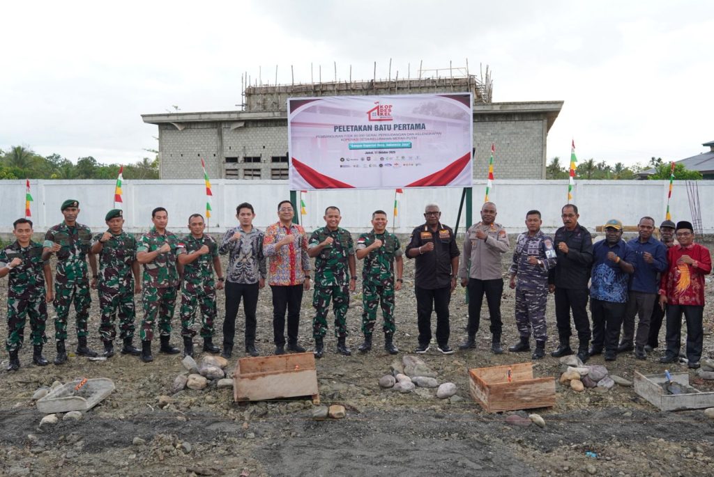 Timika – Bertempat di Kampung Limau Asri Timur, Sp.5, Distrik Iwaka, Kab. Mimika, Dandim 1710/Mimika Letkol Inf M. Slamet Wijaya, S.Sos,.M.Han,.M.A mendampingi Kasdam XVII/Cenderawasih Brigjen TNI Thevi Angandowa Zebua dalam kegiatan Gerakan Nasional Groundbreaking Koperasi Merah Putih yang secara resmi dimulai serentak di seluruh Indonesia hari ini melalui video conference (vidcon) bersama Menteri Koperasi, Ferry Joko Juliantono, Jumat (17/10/2025).