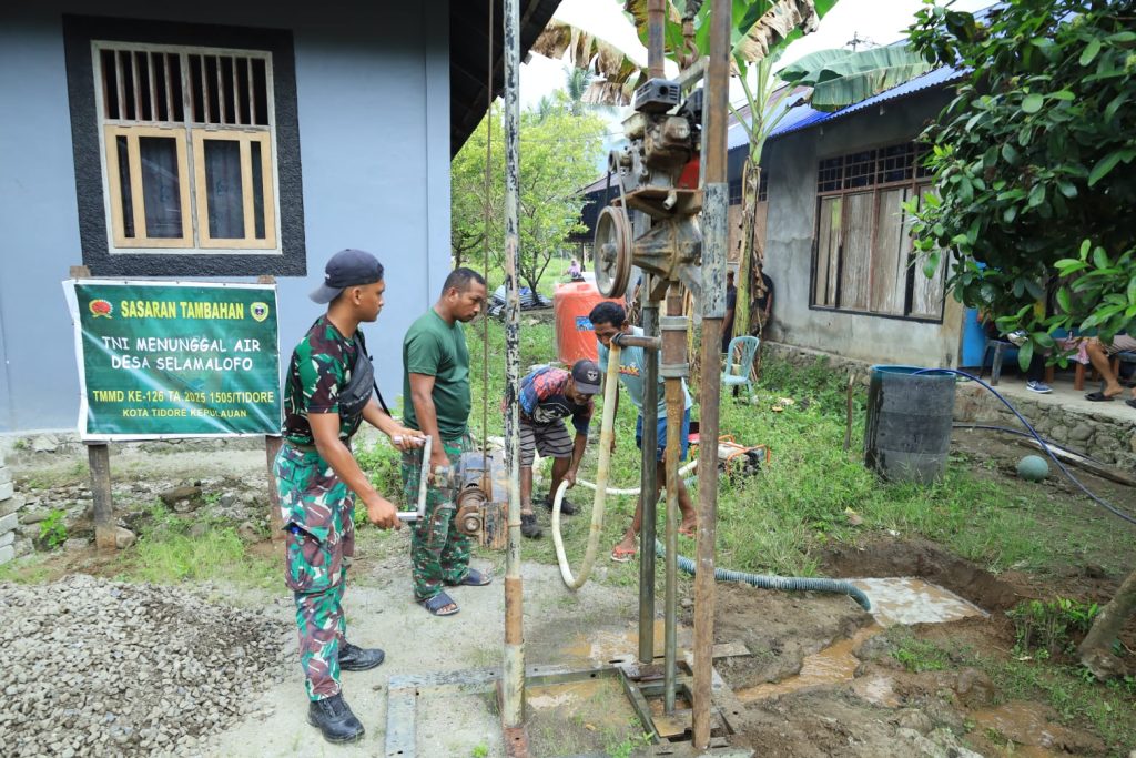 Tidore Kepulauan — Dalam rangka membantu memenuhi kebutuhan air bersih masyarakat, Satgas TMMD ke-126 Kodim 1505/Tidore melaksanakan pembangunan sumur bor di empat titik wilayah Kecamatan Oba Selatan, Kota Tidore Kepulauan, Jum’at (24/10/2025). Pengeboran sumur bor dimulai di Desa Selamalofo, kemudian dilanjutkan ke titik kedua di Dusun Tafaga, Desa Maidi. Selanjutnya, kegiatan pengeboran berlanjut di Desa Hager hingga ke beberapa lokasi lain yang telah ditentukan sesuai hasil survei kebutuhan air bersih di wilayah Oba Selatan.