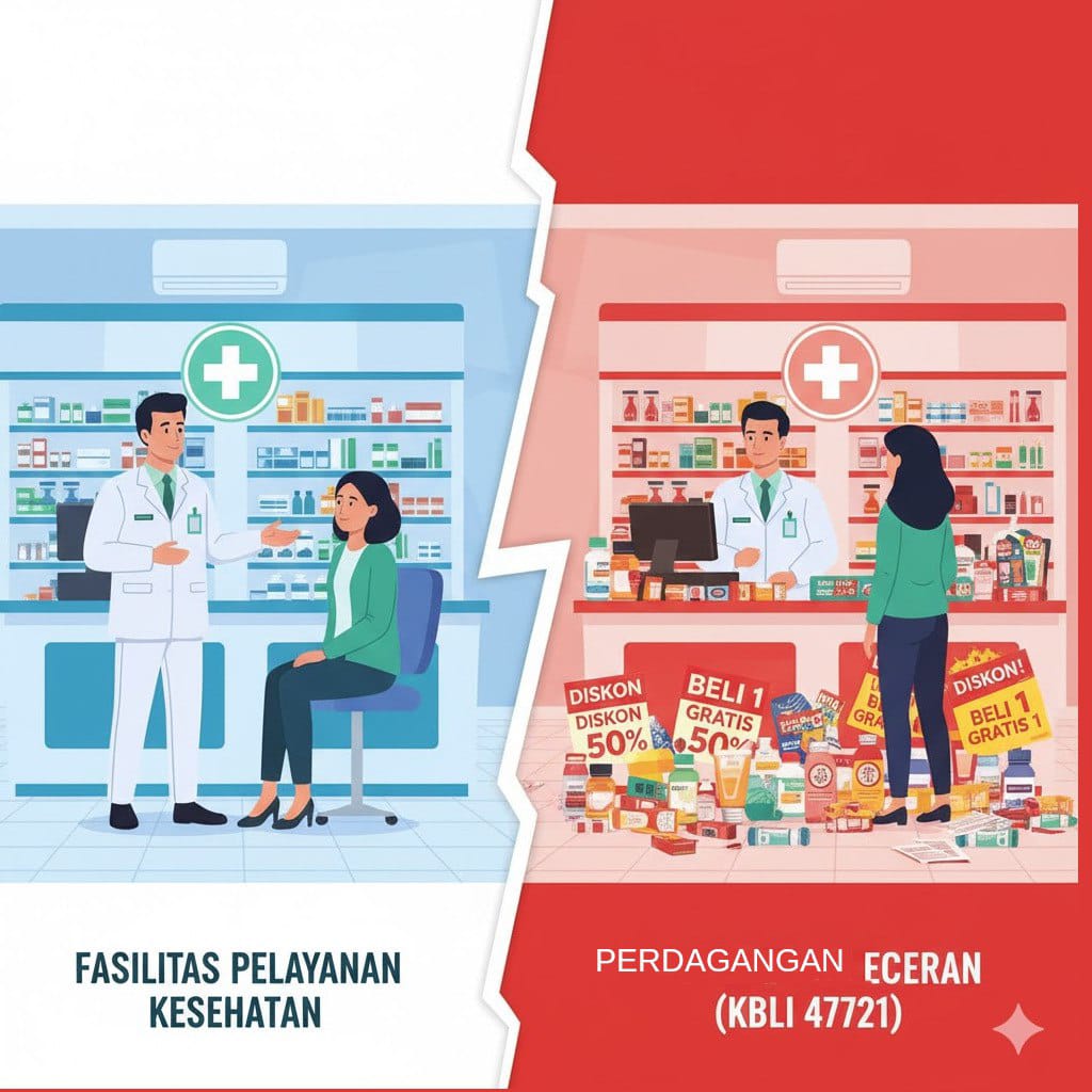 Pokok permasalahan terletak pada perubahan fundamental status hukum apotek. Dalam UU 17/2023 Pasal 170, apotek secara tegas dikategorikan sebagai “Fasilitas Pelayanan Kesehatan Penunjang”. Namun, Permenkes 11/2025 melalui Pasal 5 ayat (2) mengklasifikasikannya sebagai “Kegiatan Usaha Kefarmasian” dengan KBLI: (47721), yakni “Perdagangan Eceran Barang dan Obat Farmasi untuk