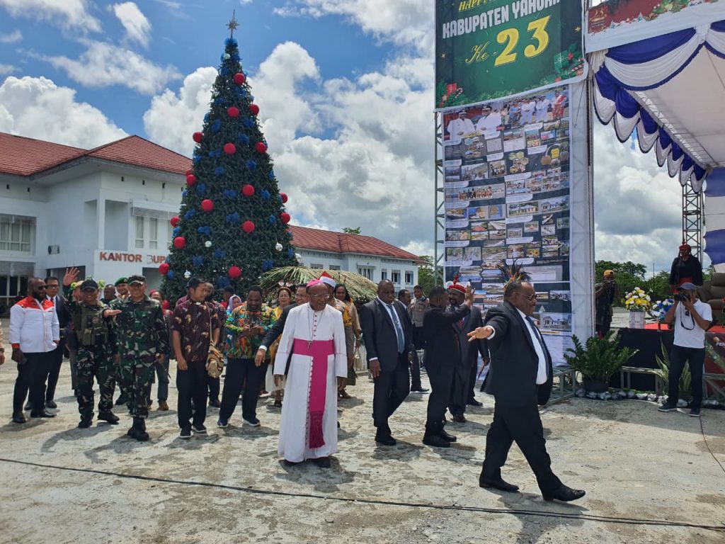 Yahukimo – Komandan Kodim 1715/Yahukimo Letkol Inf Didiet Trilaksono, S.M.,M.H.I. menghadiri acara peringatan HUT ke-23 Kab. Yahukimo dan Natal Bersama Kab. Yahukimo bertempat di kantor Bupati Yahukimo, Distrik Dekai Kab. Yahukimo, Kamis (11/12/2025).