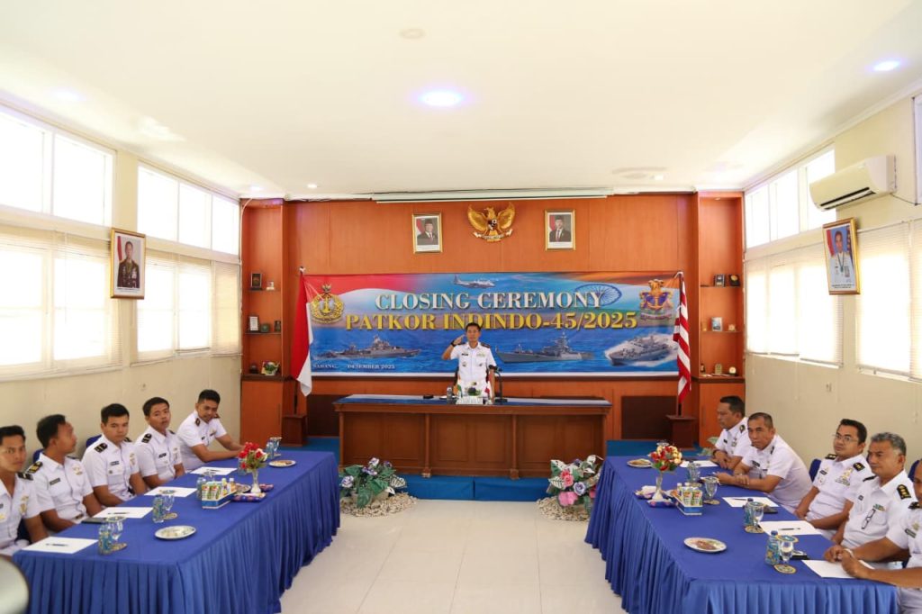 TNI AL, Sabang,- Komandan Pangkalan TNI AL (Danlanal) Sabang Kolonel Laut (P) Sadimin, S.E., M.Tr.Opsla., selaku Dansatgas Patkor Indindo-45/2025 gelar kegiatan Closing Ceremony Patkor Indindo 45/2025 secara virtual yang didampingi Pejabat Utama serta Perwira TNI AL yang berada di wilayah Kota Sabang bersama Indian Navy yang berada di India. Kegiatan tersebut digelar di Aula Teuku Umar Mako Lanal Sabang, Jalan Yos Sudarso, Kuta Ateuh, Kecamatan Sukakarya, Kota Sabang, Selasa (16/12/2025).