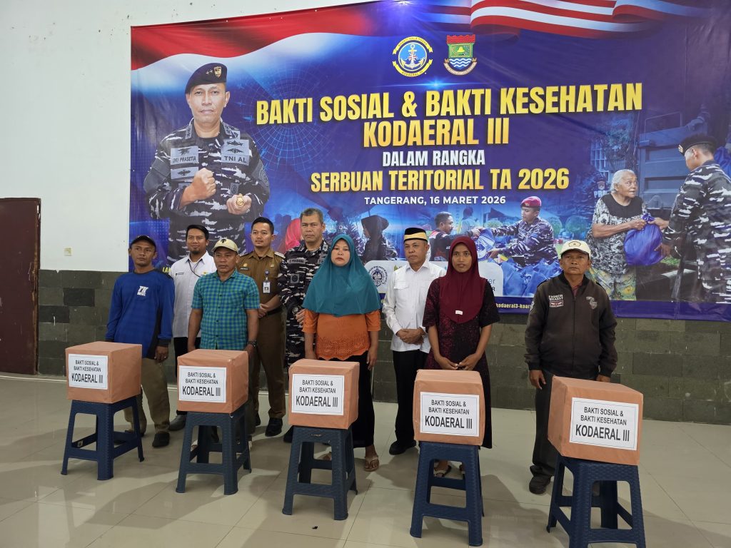 Jakarta, 16 Maret 2026 – TNI Angkatan Laut khususnya Komando Daerah TNI Angkatan Laut (Kodaeral) III, kembali menunjukkan kepeduliannya terhadap masyarakat maritim dengan menyelenggarakan kegiatan bakti sosial (baksos) dan bakti kesehatan dalam rangka serbuan teritorial Tahun 2026 di Balai Pertemuan Kecamatan Kronjo, Tangerang, Banten, Senin (16/3).